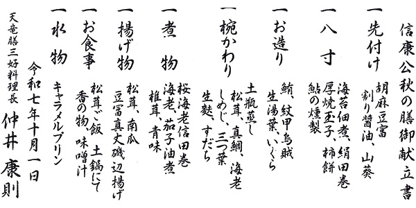 信康公 初夏の膳に続き秋の膳が登場。家康公嫡男、松平三郎信康公が悲劇の切腹を遂げた二俣城と所縁のある、当店ならではの秋限定メニューです。定番の土瓶蒸し、天婦羅、炊き込み御飯と松茸を様々な調理方法でお召し上がりいただきます。二俣城址を借景とした枯山水庭園を眺めつつ信康公に想いをはせながらお楽しみください。